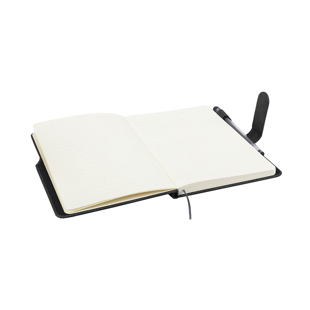 Libreta con seguro imantado y hojas rayadas de 80 gr. Material con acabado tipo cuerina. Incluye lapicero Trimax GL32 de regalo.