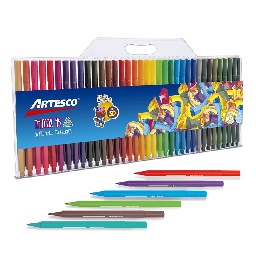 - Plumones delgados triangulares en estuche x 36 colores.
